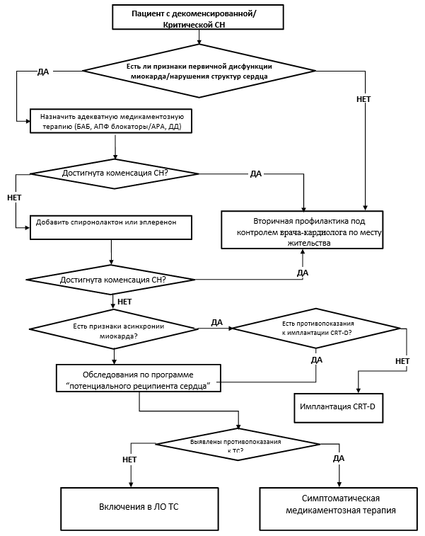 Представлено описание технологии оказания медицинской помощи, предполагающей проведение обследований с целью выбора тактики ведения пациентов с сердечной недостаточностью в терминальной стадии, определения показаний для трансплантации сердца или имплантации устройств механической поддержки кровообращения, определения периоперационного риска и статуса очередности для включения пациентов в лист ожидания трансплантации сердца, а также стабилизацию клинического состояния и оценку возможности восстановления/реабилитации пациента после проведения операции ортотопической трансплантации сердца, ведение пациентов после выполненной трансплантации сердца.