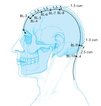 • Проникновение патогенной Ци в голову: V10 Тянь-чжу, V11 Да-чжу, V66 Цзу-тун-гу, V65 Шу-гу ,.