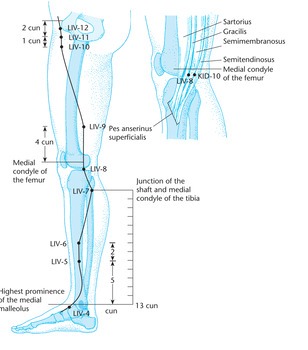 2. Цзу» - «нога»; «у» - «пять, пятый»; «ли» - «место, положение». Точка расположена на ноге. На ножном цзюэ-инь канале печени четырнадцать точек. Цзу-у-ли F.10 - на пятом месте с конца.