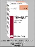Капсулы 100 мг. Размер № 1 с непрозрачными крышечкой розового цвета и корпусом белого цвета. На капсулах черными чернилами нанесены надписи: на крышечке - «Temodal», на корпусе - «100 mg», торговый знак в виде стилизованных букв «SP» и две полоски.