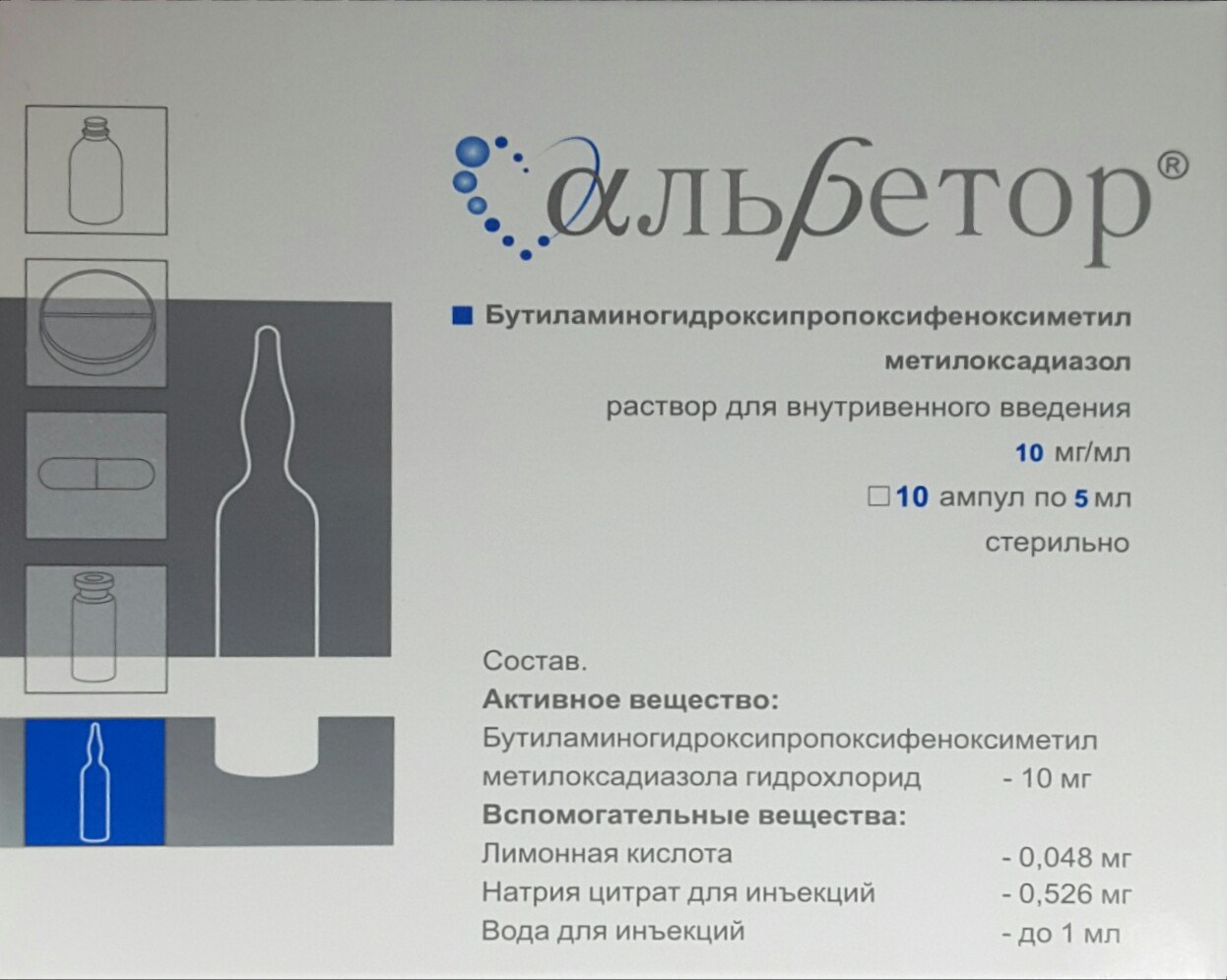 | бутиламиногидроксипропоксифеноксиметил метилоксадиазола гидрохлорида (проксодолол) | 10 мг |