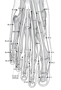 • Болезни ножного тай-инь канала селезенки: боль в эпигастральнойобласти, вздутие живота, понос, тяжесть и боль во всем теле, боль встопе и голеностопном суставе, похолодание конечностей.