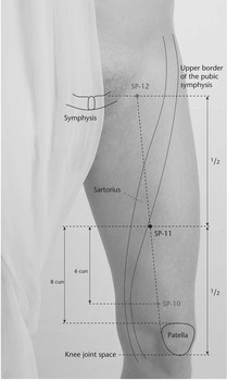 Локализация:на внутренней поверхности бедра, на соединительной линии между точкамиСюэ-хай RP.10 и Чун-мэнь RP.12, на 6 цуней выше точки Сюэ-хай RP.10.