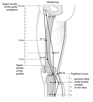 • Болезни ножного тай-инь капала селезенки: отечность и боль в паховой области, боль во внутренней поверхности бедра.