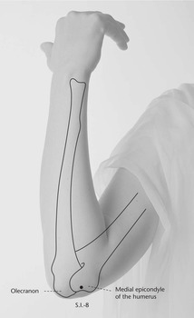 Локализация. При согнутой в локтевом суставе руке, в углублении между локтевым отростком локтевой кости и медиальным надмыщелком плечевой кости.