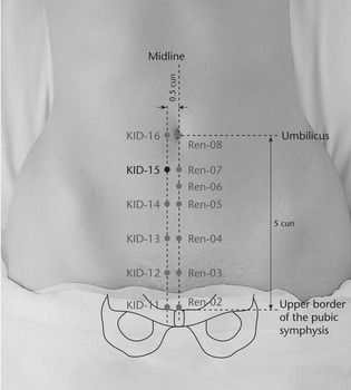 1. Чжун» - «внутрь, середина»; «чжу» - «вливаться». Точка относится к ножному шао-инь каналу почек, внутрь от нее расположена матка. Ножной шао-инь почек поднимается по животу, в месте расположения этой точки квинтэссенция Цзин почек вливается внутрь в матку.