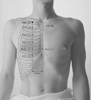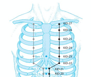 Название. «шу» - «акупунктурная точка»; «фу» - «дворец, средоточие, место скопления». Шу-фу R.27 - последняя точка ножного шао-инь канала почек, Ци которого от ступней достигает грудной клетки и скапливается в этой точке, после чего вливается в ручной цзюэ-инь канал перикарда.