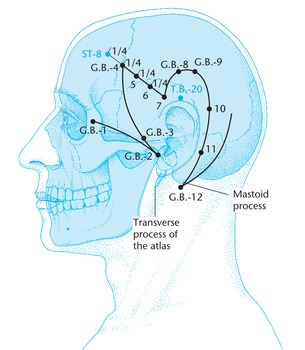 • Паралич лицевого нерва: VB12 Вань-гу, Е6 Цзя-чэ, Е4 Ди-цан, V2 Цуань-чжу, VB1 Тун-цзы-ляо, GI4 Хэ-гу ,.