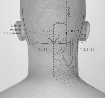 Локализация:на 1,5 цуня прямо вверх от точки Фэн-чи VB.20, на уровне верхнейграницы наружного затылочного выступа, на 2,25 цуня кнаружи от заднейсрединной линии.
