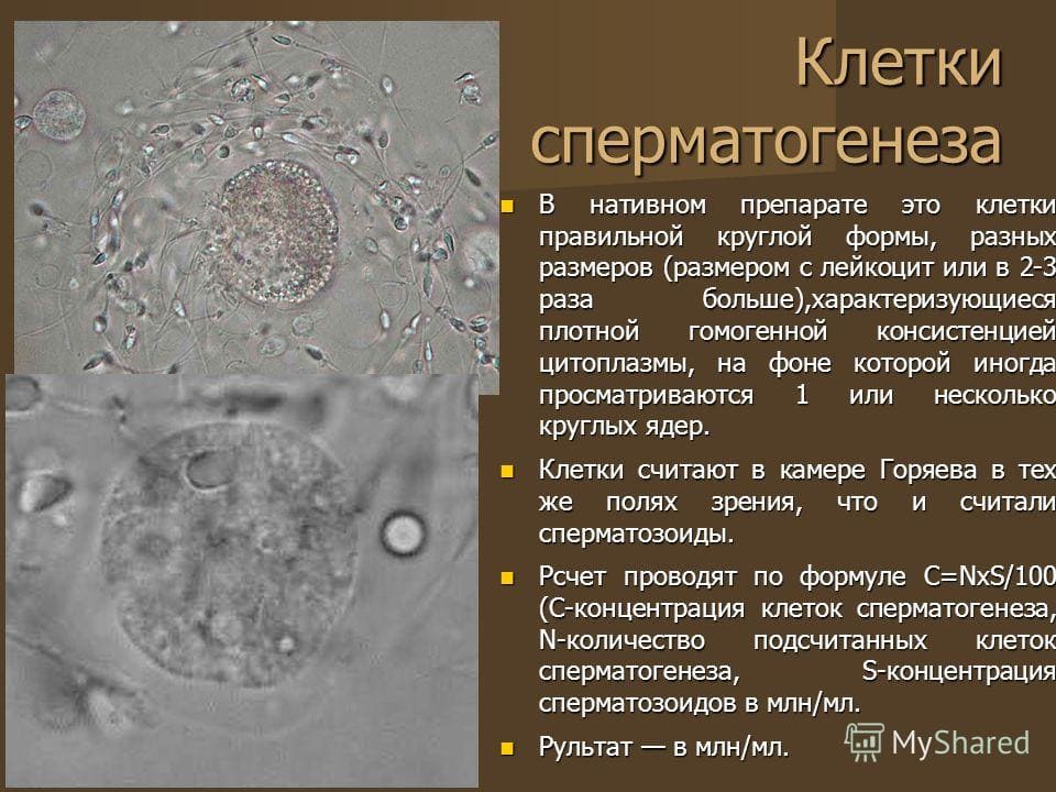 Кроме сперматозоидов в эякуляте присутствуют так называемые округлые клетки. Под этим собирательным названием подразумевают лейкоциты и незрелые клетки сперматогенеза, то есть клетки, из которых в яичках образуются зрелые сперматозоиды.