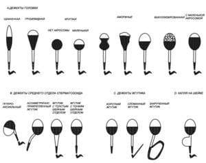 • тератозооспермия - наличие в спермограмме сперматозоидов с отклонением от нормальной формы головки и хвоста более 50%, при отсутствии изменений их подвижности и количества;