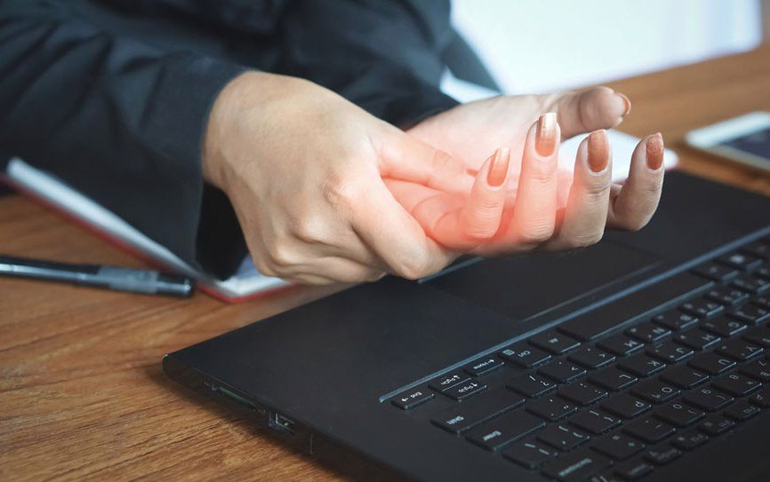 • Синдром запястного канала. Поражение срединного нерва при компрессии в узком костном канале проявляется онемением 1-3 пальцев.