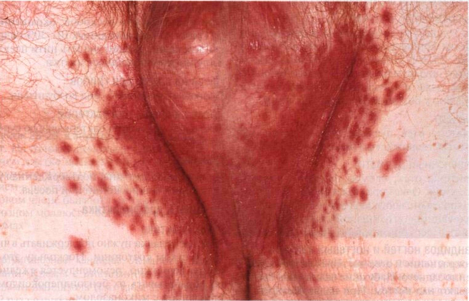Чаще всего посттравматическую микробную экзему выявляют в области мошонки. Высыпания локализуются вокруг царапин и ссадин от бритья, расчесов, возникших на фоне других патологических состояний. В редких случаях в паху и мошонке визуализируются зудящие и мокнущие красные очаги сикозиформной микробной экземы.