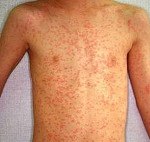 • через 3-4 дня на коже головы появляется незудящая сыпь, которая затем распространяется по всему телу. Высыпания появляются в виде отдельных красных пятен, которые постепенно сливаются;