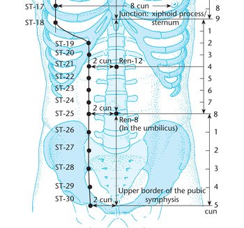 Локализация. На 2 цуня кнаружи от точки Шуй-фэнь VC.9, расположенной на 1 цунь выше пупка.