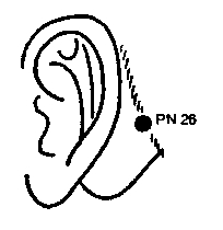 PN 26 ЯНЬ-ЧИ - точка находится позади уха, в месте пересечения горизонтальной линии, проведенной через наиболее выступающую часть сосцевидного отростка, с вертикальной линией границы волос.