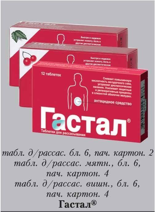 Препарат Гастал - комбинированный антацидный препарат, буферный антацид, который снижает повышенную кислотность желудочного сока и не оказывает стимулирующего влияния на секрецию желудочного сока.