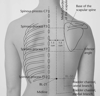 Локализация. На 1,5 цуня кнаружи от места под остистым отростком XII грудного позвонка.