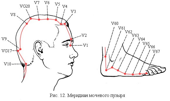 Меридиан мочевого пузыря - парный, симметричный, центробежный, относится к системе ян. Насчитывает 67 точек акупунктуры на каждой стороне.