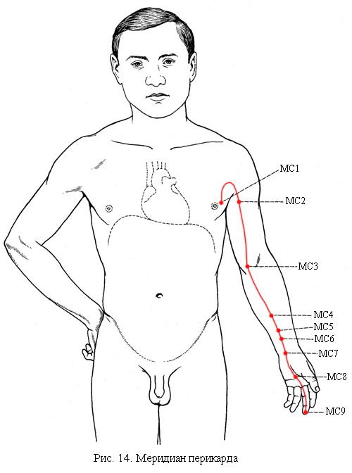 Меридиан перикарда - парный, симметричный, центробежный, относится к системе инь. Насчитывает 9 точек акупунктуры на каждой стороне.