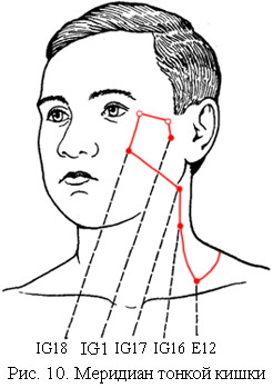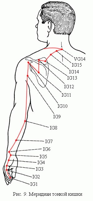 Меридиан тонкой кишки - парный, симметричный, центростремительный, относится к системе ян. Насчитывает 19 точек акупунктуры на каждой стороне.