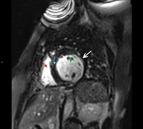 МРТ сердца. Правый желудочек (красная стрелка), левый желудочек (зеленая стрелка), желудочковая перегородка (синяя стрелка). Позднее усиление субэндокардиального контраста левого желудочка, характерное для инфаркта миокарда (белая стрелка).
