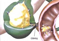 Свищ желчного пузыря. Патологический анастомоз формируется между желчным пузырем и внутренними органами или передней брюшной стенкой. Для наружного свища указывает на выделение желчи или слизи через отверстие в передней брюшной стенке. Симптомы внутреннего свища зависят от его расположения (в плевральной полости, в бронхах, в пищеварительном тракте ). Диагноз этой патологии состоит в выполнении рентгенографии, фистулографии, RCP и ультразвукового исследования гепатобилиарного тракта. Хирургическое лечение - удаление свища, холецистэктомия и восстановление нормального оттока желчи.