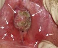 Самопроизвольное или хирургическое вскрытие не приносит долговременного облегчения: дренированная полость быстро закрывается, рост новообразования продолжается. Со временем увеличенное новообразование приводит к затруднениям при выделении мочи и кала, начинает вызывать серьезный дискомфорт при ходьбе, сидении. Опухоль может достигать значительных размеров (10 см и более). Некротический распад сопровождается обильным зловонным отделяемым, наружным кровотечением.