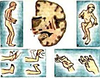 • При доминантном поражении подкорковых образований: атетоз, хорея, баллизм, торсионная дистония. Характерным является отсутствие ритма, вариативность, сложность движений, мышечная дистония.
