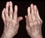 • Рентгенография суставов. На фото пораженные суставы, периартикулярный остеопороз, сужение суставного пространства, видны многочисленные эрозивные дефекты.