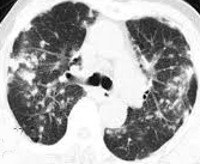 • Рентгенография или КТ легких. На рентгенограмме или компьютерной томограмме видны небольшие темные круглые области, в основном в периферических частях легких. Корневые и средостенные лимфатические узлы часто увеличены. Возможно плевральный отек.