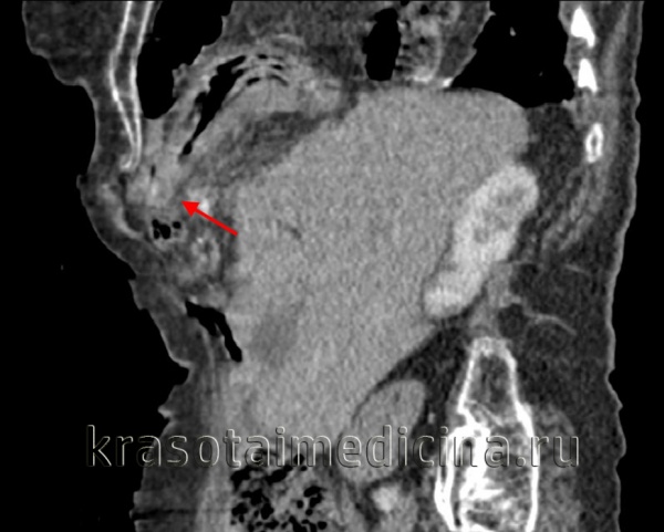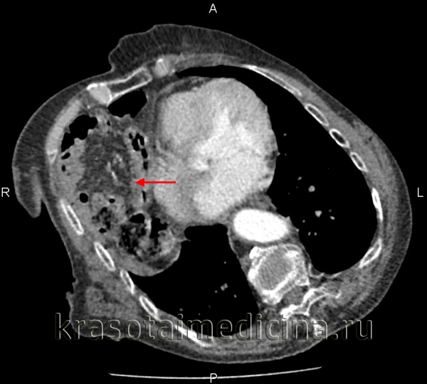 КТ молочной железы. Травматическое событие кишечника, сальника в грудной полости.