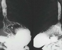 • Рентгенография. При общем рентгенологическом исследовании грудной клетки видны контуры желудочного пузыря и его верхней части в необычном месте. Для уточнения анатомических особенностей рекомендуется диагностика с контрастированием в полости рта: на фото пищевод короткий, без перегибов, бороздка расположена над диафрагмой.