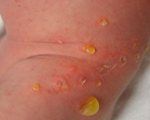 Основное проявление дерматозов - высыпания, которые различаются в зависимости от типа заболевания. При пиодермии у новорожденного пустулезная сыпь проявляется в виде глубоких желтоголовых пустул (при стафилодермии) или плоских поверхностных пузырьков, заполненных гнойным содержимым (при стрептодермии). Высыпания обнаруживаются на покрасневшей, опухшей коже. Со временем они раскрываются при трении или сжимаются с образованием желтых корок.