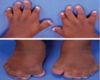 Еще один частый симптом синдрома Карпентера - аномалии развития пальцев рук и ног. Часто наблюдается кожная синдактилия - также возможно сращение мягких тканей соседних пальцев, отсутствие средних фаланг и деформация большого пальца. У некоторых пациентов на руках шестипалый, а чаще лишний мизинец, а на ногах - любой палец от I до IV. По мере взросления становится заметным короткий, задержанный рост.