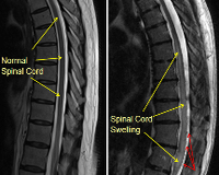 • Дегенеративные заболевания. При органических демиелинизирующих поражениях спинного мозга (боковой амиотрофический склероз, рассеянный склероз) образуются очаги нейродегенерации, которые запускают процесс нарушенной динамики спинномозговой жидкости, скопления интерстициальной жидкости. Также отек возможен при поперечном миелите и других воспалительных заболеваниях позвоночника.