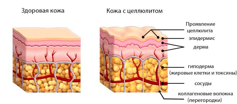 Анатомические особенности женской кожи обусловлены детородной функцией. При беременности кожа должна быть способна к значительному растяжению, поэтому природа предусмотрела большую податливость женской кожи. Соединительные ткани ее слабее и более рыхлые, чем у мужской кожи. В женской коже существует параллельное расположение соединительнотканных волокон, поэтому клетки жировых тканей могут сквозь них «продавливаться». У мужчин, напротив, этого не происходит, поскольку волокна соединительной ткани располагаются крестообразно, образуя барьер для продавливания жировых клеток. Таким различием объясняется своеобразие внешних проявлений целлюлита у мужчин и женщин.