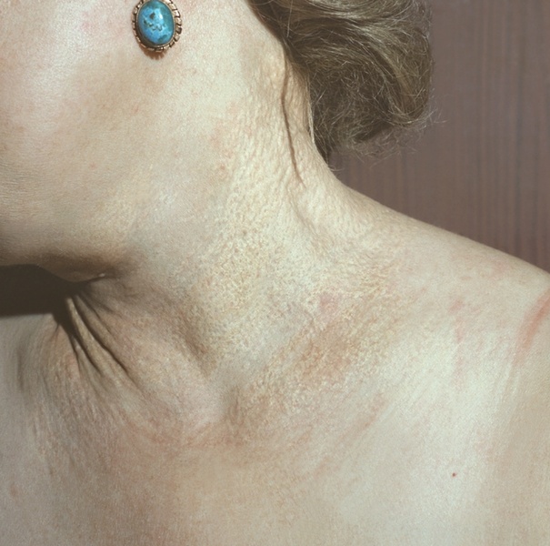 Кожа шеи, подмышечных областей, паха и области вокруг пупка толстая, имеет множество складок, жесткая. Желтоватые плотные узлы придают коже больного сходство с кожей цыпленка. Изменения в сетчатке глаз могут приводить к выраженному снижению зрения и даже слепоте.