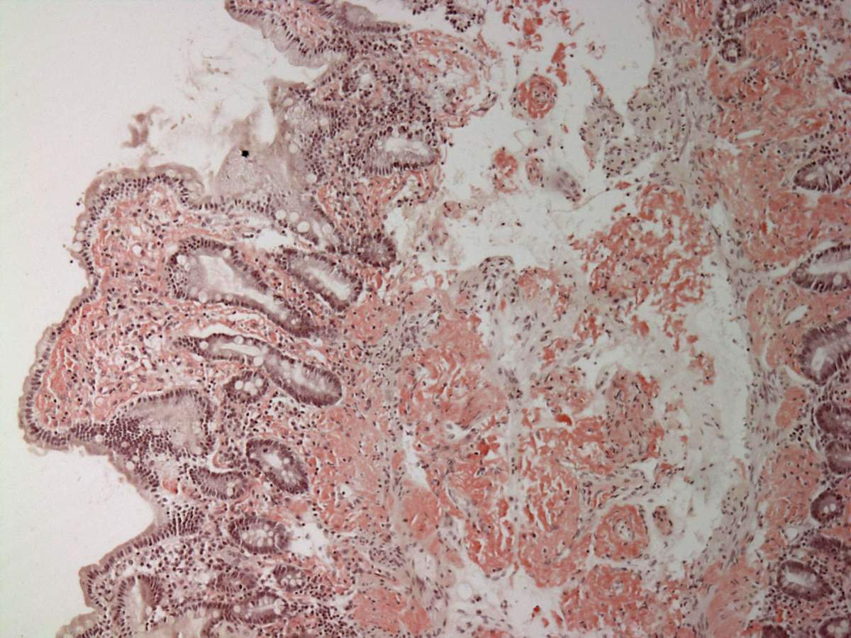Амилоидоз кишечника проявляется ощущением дискомфорта, тяжести, реже умеренными тупыми или спастическими болями в животе, нарушениями стула: запорами или упорными поносами. В крови анемия, лейкоцитоз, повышение СОЭ, гипопротеинемия (за счет гипоальбуминемии), гиперглобулинемия, гипонатриемия, гипопротромбинемия, гипокальциемия.