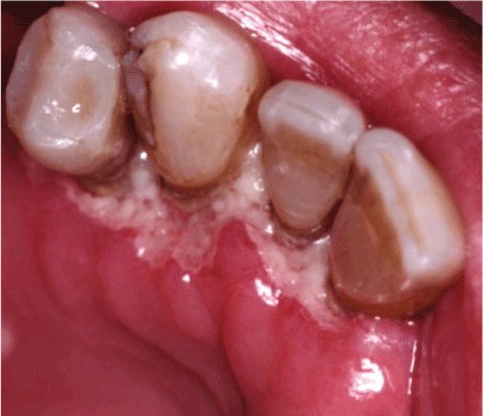 Гингивит может возникать, как в результате грибкового процесса, так и при бактериальном инфицировании. Выделяют маргинальный гингивит (краевая гингивальная эритема), при которой слизистая оболочка, покрывающая край десны, гиперемирована, отечна, напряжена. Язвенно-некротическая форма заболевания характеризуется прогрессированием процесса с изъязвлением и некрозом десневых сосочков и маргинальной десны. При осмотре выявляется некротическая пленка (чаще серо-желтого цвета), покрывающая край десны. Возможны кровотечения, как спонтанные, так и при чистке зубов. Это состояние отмечается у пациентов с выраженной иммунной супрессией [15,23]. Язвенно-некротический гингивит выявлен нами у 74%ВИЧ-инфицированных в стадии СПИД.
