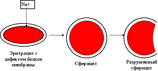 Наследственный дефект структуры мембраны эритроцитов приводит к повышенной проницаемости ее для ионов натрия и накоплению воды, что в свою очередь ведет к чрезмерной метаболической нагрузке на клетку, потере поверхностных субстанций и формированию сфероцита. Формирующиеся сфероциты при движении через селезенку начинают испытывать механическое затруднение, задерживаясь в красной пульпе и подвергаясь всем видам неблагоприятных воздействий (гемоконцентрация, изменение рН, активная фагоцитарная система), селезенка активно наносит сфероцитам повреждения, вызывая еще большую фрагментацию мембраны и сферуляцию. Это подтверждается при электронно-микроскопических исследованиях, позволивших обнаружить ультраструктурные изменения в эритроцитах (утолщение клеточной мембраны с ее разрывами и образованием вакуолей). Через 2-3 пассажа через селезенку сфероцит подвергается лизису и фагоцитозу. Селезенка является местом гибели эритроцитов; продолжительность жизни которых сокращается до 2 недель.