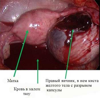Киста жёлтого тела яичника. Функциональное ретенционное образование яичниковой ткани, формирующееся на месте нерегрессировавшего желтого тела. Киста жёлтого тела яичника протекает практически бессимптомно. В редких случаях сопровождается незначительной болезненностью внизу живота, нарушением менструального цикла, осложненным течением. Диагностика включает осмотр гинеколога, УЗИ, допплерографию, лапароскопию. Киста желтого тела яичника может регрессировать самостоятельно в течение 3-х менструальных циклов; при осложнениях показана кистэктомия, резекция или удаление яичника.