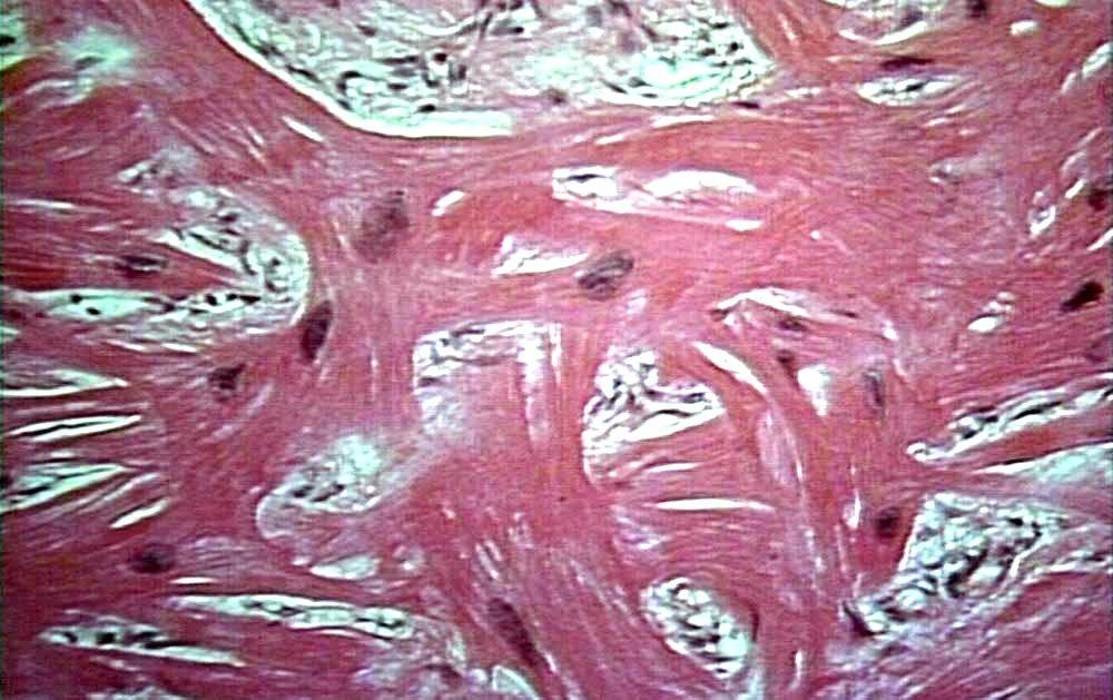 1. Чистая форма ПКМП: макроскопический образец содержит в себе дилатацию ПЖ с выпячиваниями в области «треугольника дисплазии» (фиброзная и жхзировая ткань окутывают ПЖ в виде пятен, распространяясь на область верхушки, воронки и трикуспидальную область в форме треугольника. Большая часть массы миокарда замещена жиром. Типичный гистологический образец дает возможность выявить замещение среднего и наружного слоя миокарда ПЖ (менее миокард ЛЖ) жировой тканью и фиброзным ограничением. Утолщенная медия дистальной части коронарных артерий объясняет появление у таких пациентов атипичной боли в области грудной клетки, которая относится к маркерам синдрома Х.