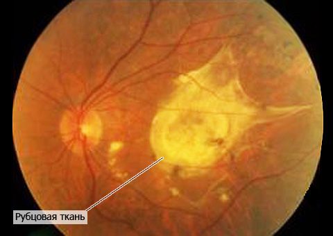 Результатом роста патологических сосудов и кровотечений из них является нарушение работы нервных клеток сетчатки, неизбежно ведущее к снижению зрения. Выраженность симптомов зависит от размера хориоидальной неоваскулярной мембраны, ее близости к макуле и может варьировать от незначительного снижения остроты зрения до появления центрального слепого пятна.