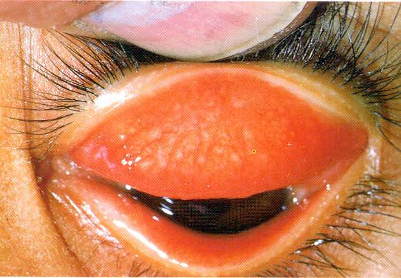 Инкубационный период при трахоме занимает 7-14 суток. Манифестация заболевания чаще острая, течение трахомы длительное, хроническое. В трахоматозный процесс обычно вовлекаются оба глаза. Отмечается появление в глазах чувства жжения и ощущений инородного тела. При остром начале трахомы ярко выражены симптомы конъюнктивита - гиперемия и отечность слизистой век, обильное отделяемое слизисто-гнойного характера, светобоязнь. На слизистой век выявляются фолликулярные или папиллярные разрастания.