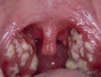 При визуальном осмотре видно, что пораженная миндалина увеличена в размерах, имеются гнойничковые образования на её поверхности. Поэтому диагностировать такое заболевание, как лакунарная ангина, не представляет особого труда.