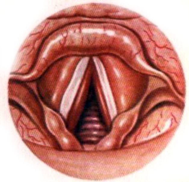 Ларингоскопическая картина субхордального ларингита представляется в виде валикообразной симметричной припухлости, гиперемией слизистой оболочки подголосового пространства. Эти валики выступают из-под голосовых складок, значительно суживая просвет гортани и тем самым затрудняя дыхание.
