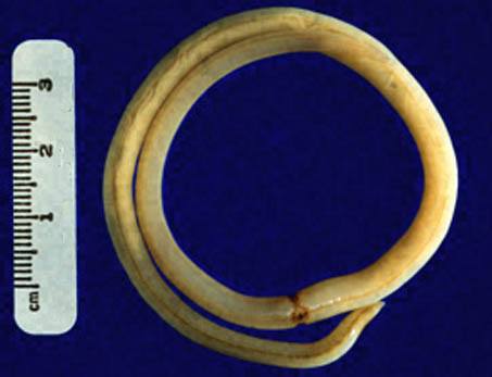 Этиологическим агентом аскаридоза является аскарида человеческая (Ascaris lumbricoides). Они отличаются веретенообразной формой и красновато-желтым оттенком тела. При гибели аскарида приобретает беловатый оттенок. Самка заметно больше самца, длина ее 25-40 ширина - 4-6 характерен загнутый задний конец тела. Самец имеет прямое тело длиной 15-25 толщина самца составляет 2-4.