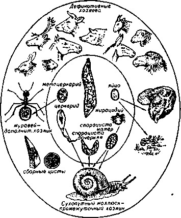 В стадии половой зрелости гельминты паразитируют в желчных протоках и в желчном пузыре крупного и мелкого рогатого скота и других млекопитающих, изредка у человека (окончательные, или дефинитивные, хозяева). Человек заражается при случайном заглатывании инвазированных муравьев, например с огородными овощами, ягодами, луговыми травами. Естественная восприимчивость людей не определена. У людей описаны лишь единичные случаи дикроцелиоза в разных странах.