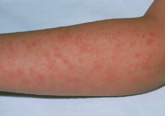 Характерная мелкоточечная сыпь возникает в первый-второй день заболевания. На фоне общей гиперемии, на кожных покровах лица и верхней части туловища (а в последующем и на сгибательных поверхностях рук, боках, внутренней поверхности бедер) возникают более темные точки, сгущаясь на кожных складках и в местах естественных сгибов (локтевой сгиб, пах, подмышечная ямка) и образуя темно-красные полосы (симптом Пастиа).